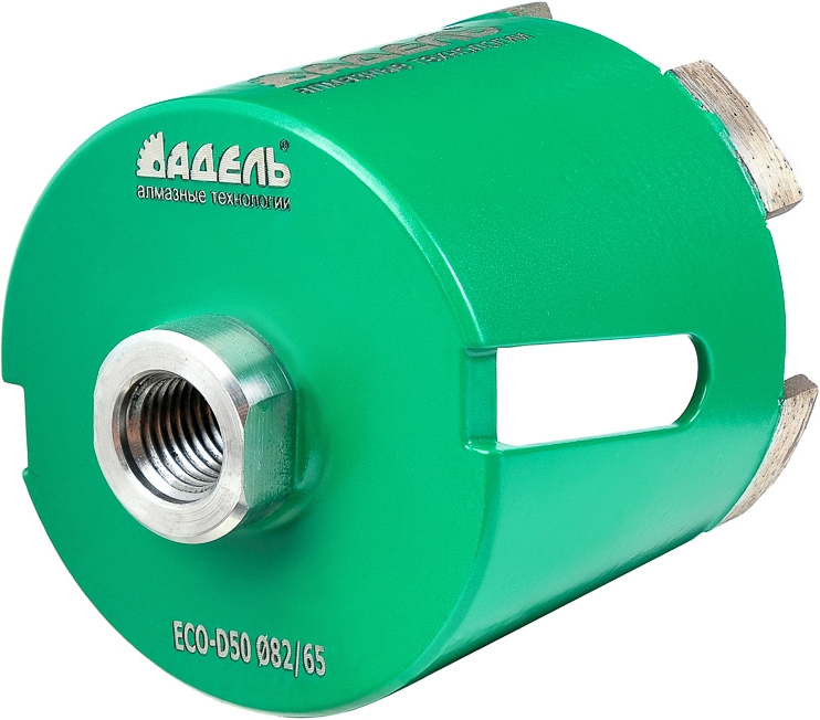 Алмазная коронка для подрозетников по бетону и кирпичу Адель Eco-D50 82/65 мм (Adel Эко-Д50 82/65 мм) предназначена для скоростного сверления неармированного бетона, кирпича, ФБС и других абразивных строительных материалов с использованием ручного электроинструмента без охлаждения водой.