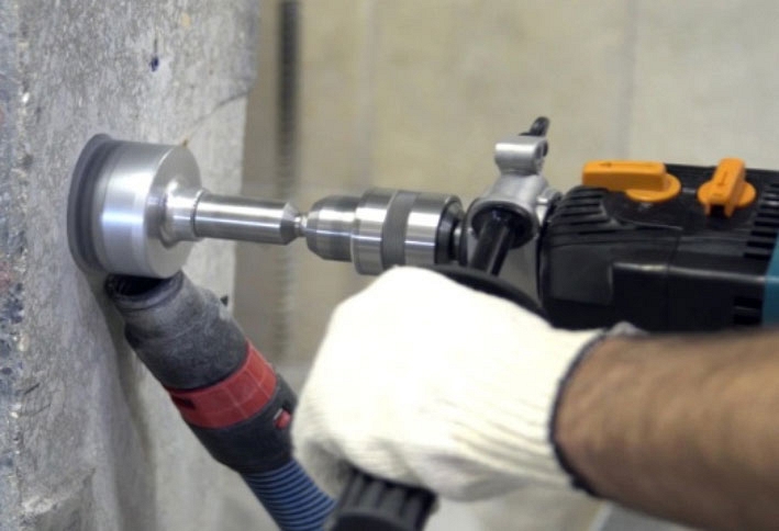 Специальная конструкция корпуса алмазной коронки, пылеуловитель и строительный / промышленный пылесос удаляют пыль. Ударная дрель или профессиональная дрель алмазного бурения с микроударом эффективно отводят пыль из зоны реза и предотвращают заклинивание алмазной коронки в процессе сверления - Возможно сверлить и с подачей воды без микроудара стандартным оборудованием для алмазного бурения