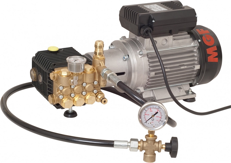 Электрический опрессовщик MGF Compact-120 Electro 120 bar, 8 l/min, 400 V (МГФ Компакт-120 Электро 120 бар, 8 л/мин, 400 В) – электрический испытательный опрессовочный насос высокого давления с манометром для гидравлических систем, противопожарных систем и систем отопления, для паровых установок на теплоэлектростанциях, в химической промышленности и на судах, а также для наполнения и создания давления в испытуемых установках.