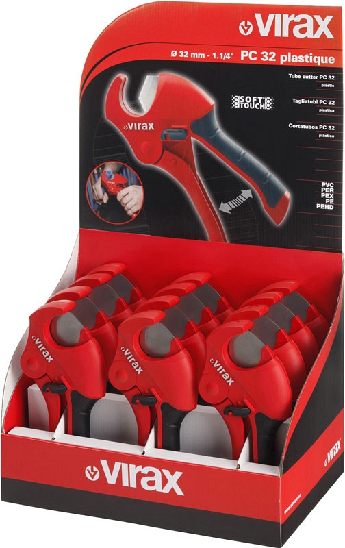 Набор ножниц для полипропиленовых труб Virax PC 32, 12 шт. (Виракс ПС 32, 12 шт.) предназначен для резки ПВХ, ПЭ, полиэтилена PERT, сшитого полиэтилена PEX, гибких пластмассовых труб (Tricoclair), шлангов спринклерных систем, шлангов для орошения, многослойных труб Ø до 32 мм (1 1/4").