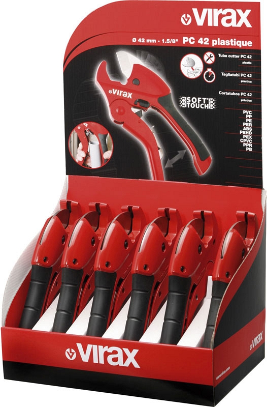 Набор ножниц для полипропиленовых труб Virax PC 42, 6 шт. (Виракс ПЦ 42, 6 шт.) предназначен для резки ПВХ, ПП (РР, полипропилен), ПЭ (PE, полиэтилен), ПЭ-С, полиэфир-сульфон, полиэтилен PE HD, PER, PEX, АБС (ABS), ПНД, ХПВХ, ППР, ПБ, многослойных труб Ø до 42 мм (1 5/8"), а также электрического кабеля Ø до 12 мм, сечением до 4 × 2,5 мм².