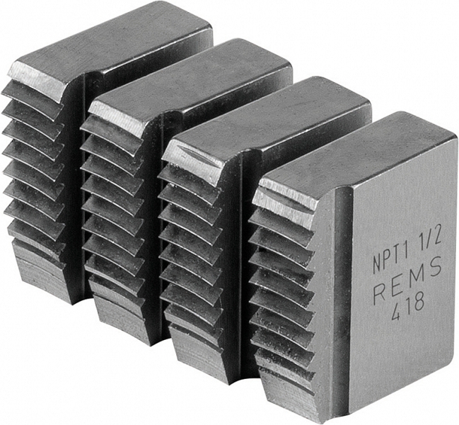 Резьбонарезные плашки Rems NPT 1 1/2" (Ремс НПТ 1 1/2") предназначены для нарезки правой трубной конической резьбы NPT (Taper Pipe Thread ASME B1.20.1) на стальных трубах Ø 1 1/2" с применением ручных и электрических резьбонарезных трубных клуппов Ева, Амиго, Амиго 2, Амиго 2 Компакт.