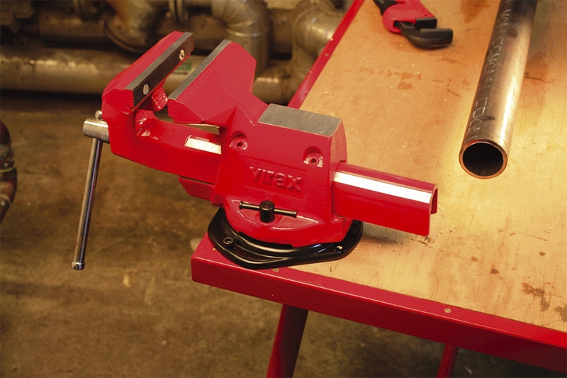 Тиски слесарные настольные с наковальней Virax 105 мм (Виракс 105 мм) – комбинированные трубные и параллельные (с параллельными зажимными губками), верстачные, поворотные (с дополнительным поворотным основанием) стальные слесарные тиски для фиксации труб Ø 1/2" – 1 1/4", а также изделий и заготовок другой формы.