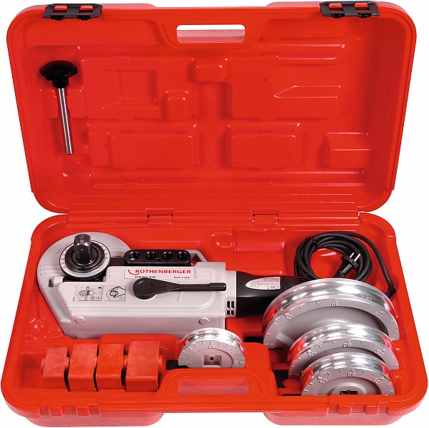Трубогиб электрический Rothenberger Robend 4000 Set 7/8"-1 1/8"-1 3/8" (Ротенбергер Робенд 4000 Сет 7/8"-1 1/8"-1 3/8") – мощный, надежный, переносной, электромеханический трубогиб с повышенной производительностью для холодной гибки под углом до 180° труб из твердой, полутвердой и мягкой меди (DIN EN 1057) Ø 12 – 35 мм; медных труб в оболочке, прецизионных мягких стальных труб (DIN 2391 / 2393 / 2394) Ø 12 – 35 мм; черных и оцинкованных стальных труб (DIN 2440 / 2441) Ø 3/8" – 1 3/8"; бесшовных стальных труб (GW 541), металлопластиковых (МПТ) труб Ø 12 – 35 мм (1/2" – 1 3/8"), толщиной стенки до 3,25 мм. Универсальное использование при монтаже систем водоснабжения, отопления, холодильной и климатической техники, прокладке трубопроводов, в промышленности, для серийного производства. Производитель: ROTHENBERGER (РОТЕНБЕРГЕР) – Германия.