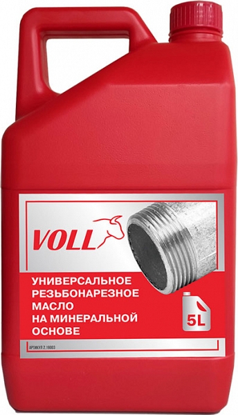Универсальное резьбонарезное масло на минеральной основе Voll 5 л (Волл 5 л) – минеральное резьбонарезное масло, минеральная смазочно-охлаждающая жидкость (сож) для режущего инструмента на минеральной основе, специально для высокопроизводительного нарезания резьбы ручными и электрическими клуппами, резьбонарезными станками с рециркуляцией резьбонарезного масла; для снижения трения при сверлении, фрезеровании и в других видах металлообработки.